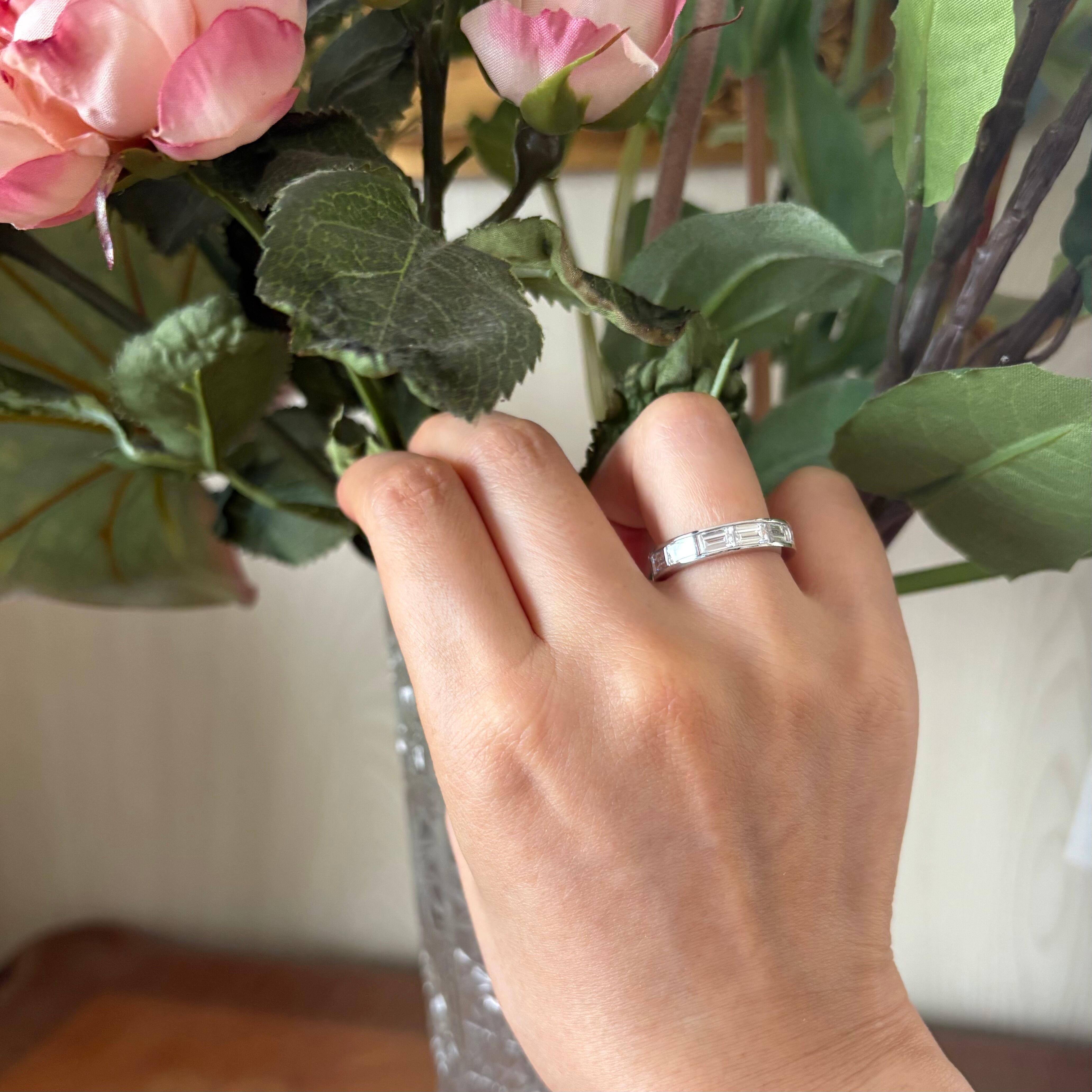 バゲットカット3×5㎜のモアサナイトがぐるっと並んだ360度どこから見ても美しい、豪華なリングです。総合計4ct超の圧巻の輝き、存在感は、どんなファッションをグレードアップさせること間違いなしです。