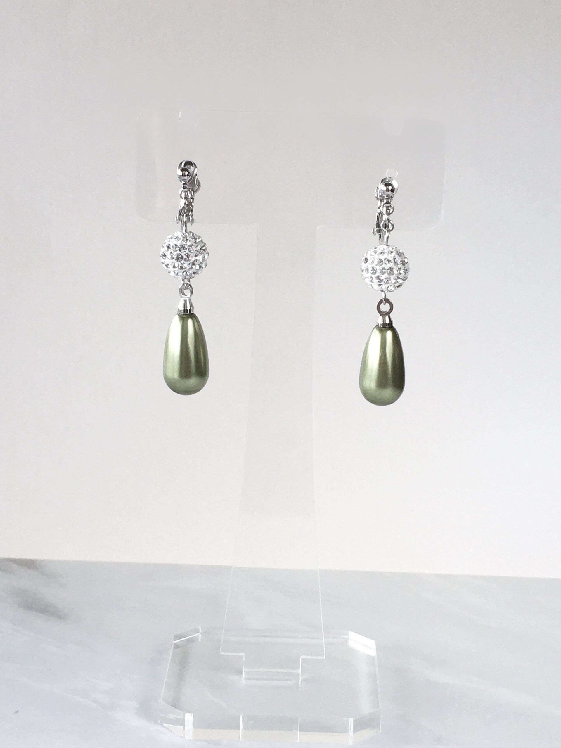 スワロフスキーを散りばめたクリスタルボールとメタリックなモスグリーン色のスワロフスキーパールを合わせたシルバーイヤリングです。