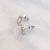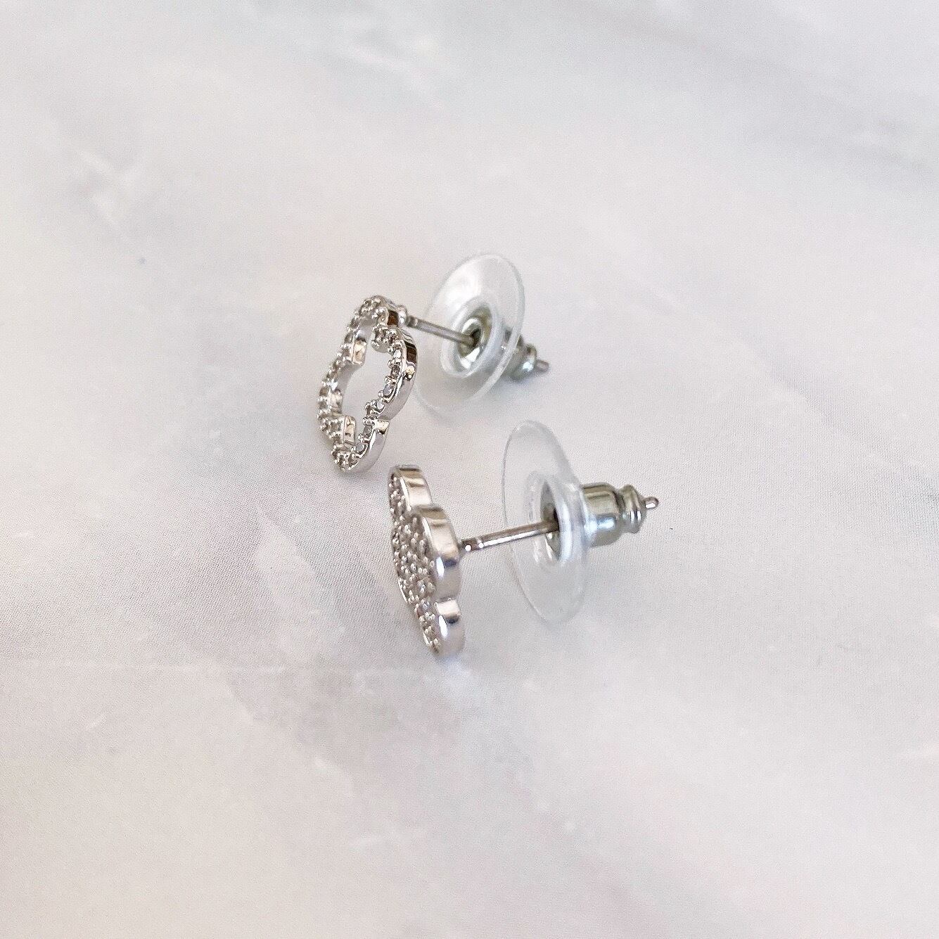 クリスタルガラスを埋めた、両耳デザインの異なるシルバーカラーのクローバーピアスです。